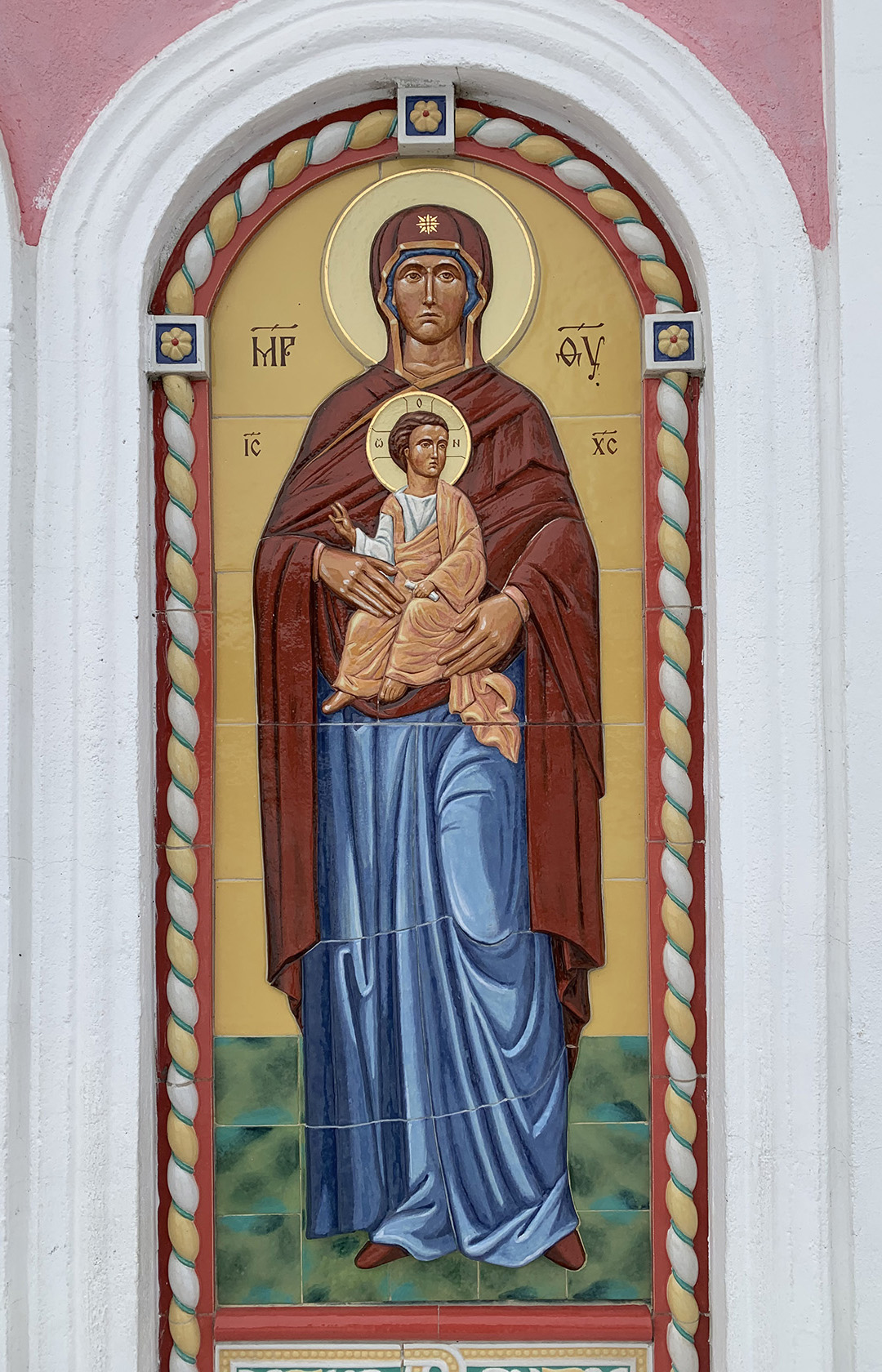Керамические иконы «Спаситель» и «Богородица с младенцем». Ворота Никитского храма. д. Бывалино. Павлово-Посадский район. Московская область. Керамика, глазури. 205х65 см. 2016 г.