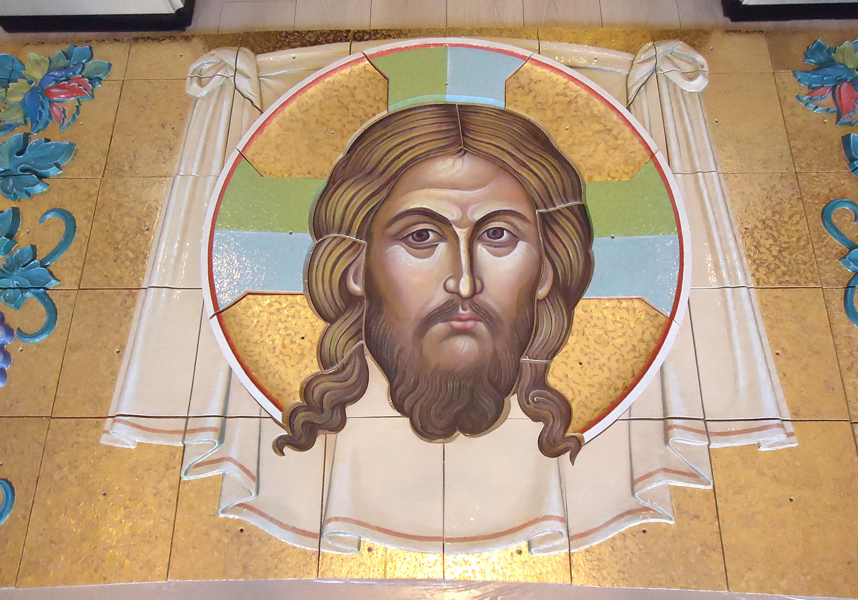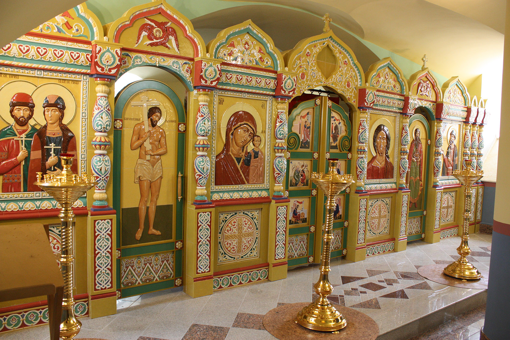 Керамический иконостас. Нижний храм Боголюбской киновии Гефсиманского Черниговского скита Свято-Троицкой Сергиевой лавры. г. Сергиев Посад. Московская область. Керамика, глазури. 2,7х8,5м. 2015 г.