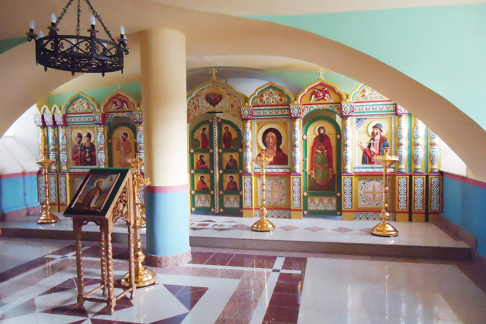 Особенностью изготовленного нами иконостаса является то, что все иконы выполнены в керамике и расписаны теми же глазурями, что и изразцы иконостаса. По просьбе настоятеля скита была изготовлена керамическая икона Черниговской Божией Матери и установлена над входом в Храм. Керамические иконы – это одна из традиций русского храмового зодчества.