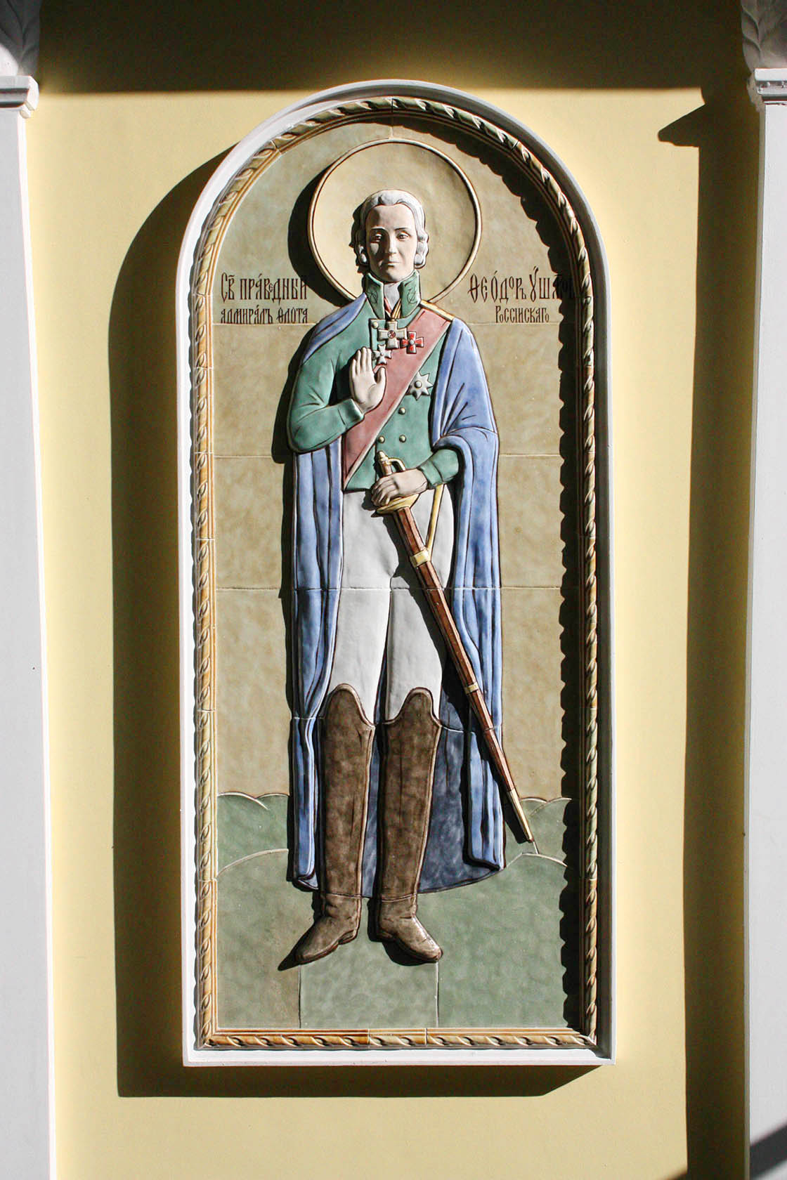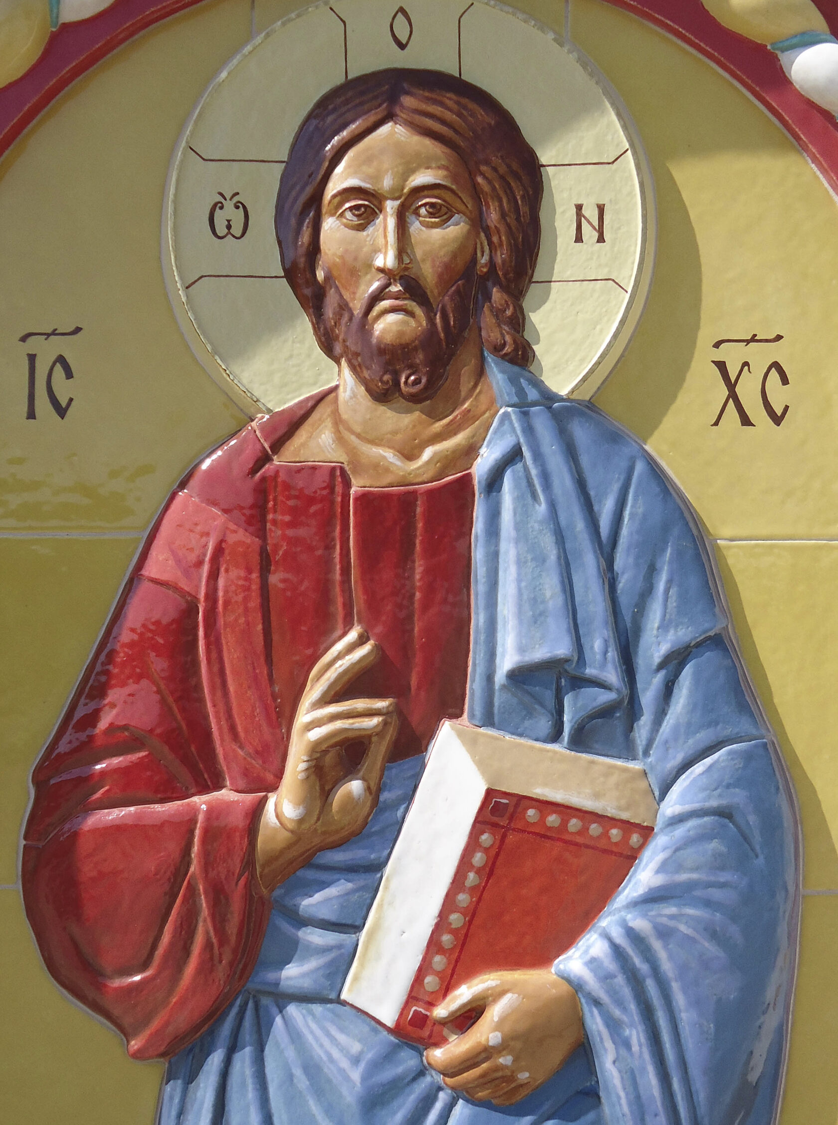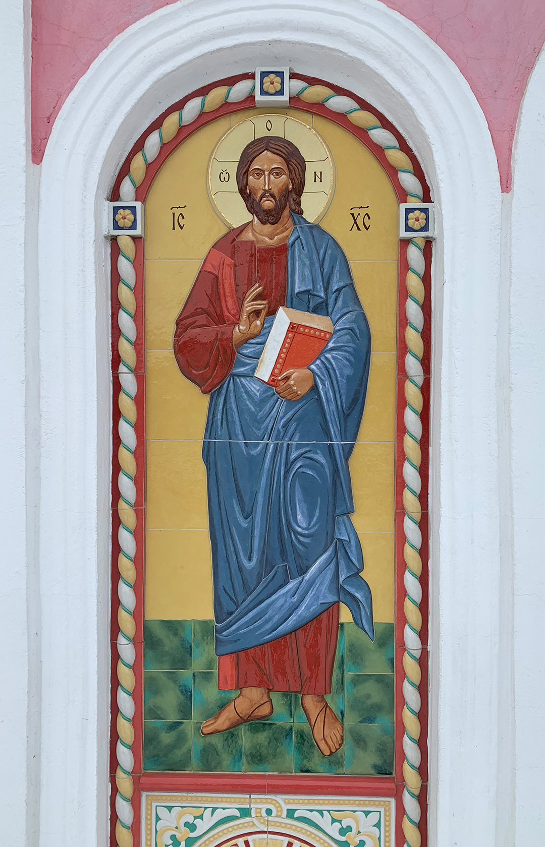 Фасадная керамика для здания Московской Сретенской духовной академии, в том числе центральное верхнее панно с изображением Спасителя и Евангелистов, два панно с деревьями на центральном фасаде и круглые медальоны по всем фасадам здания академии. г.Москва. Керамика, глазури. Верхнее панно 25,5 кв.м, панно с деревьями 17 кв.м, медальоны D 55 см. 2017 г.